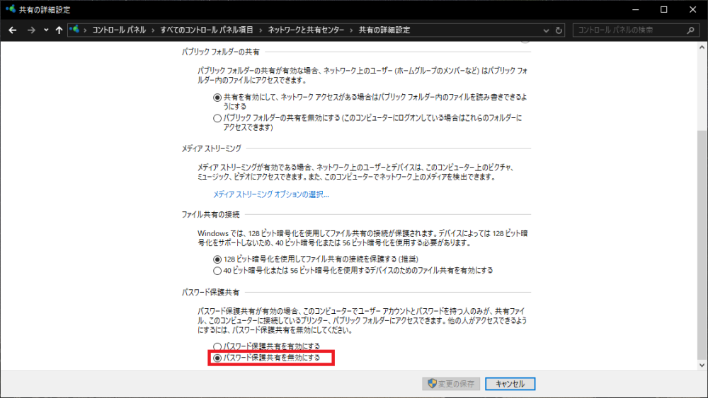 以下のように、ファイル共有設定で「パスワード保護共有」を「無効」にしてもアクセス時にパスワードが求められる場合があります。