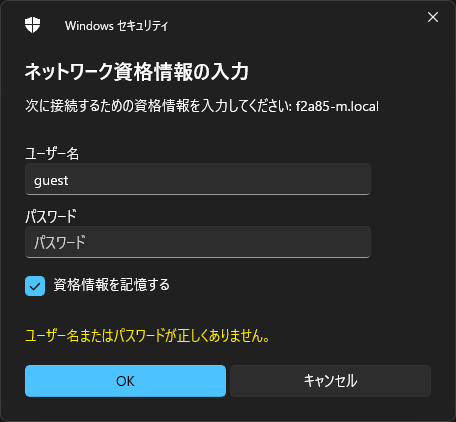 ※Windows 11 24H2 以降はセキュリティ強化により共有フォルダへの安全でないゲストログオンが標準で拒否されるため、上記では解決できません。パスワードが設定されたユーザーでアクセスするか、Pro エディション限定になりますがグループポリシーエディタ(gpedit.msc)で「安全でないゲストログオンを有効にする」を有効にする必要があります。